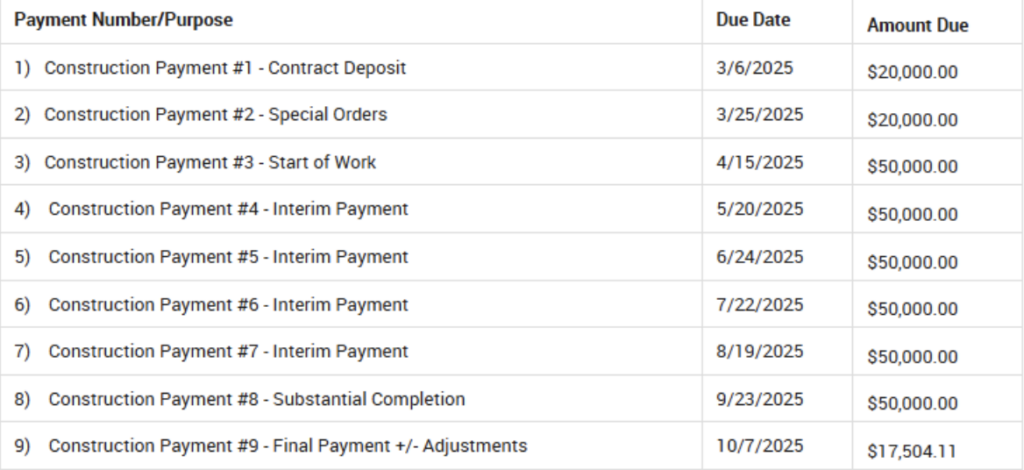 A payment schedule typically starts with a contract deposit of no more than 10% of the contract value, followed by a special orders payment at the time of long-lead time material orders. These two payments make up the first part of the payment schedule and account for all money requested prior to the start of construction to help the project get underway.